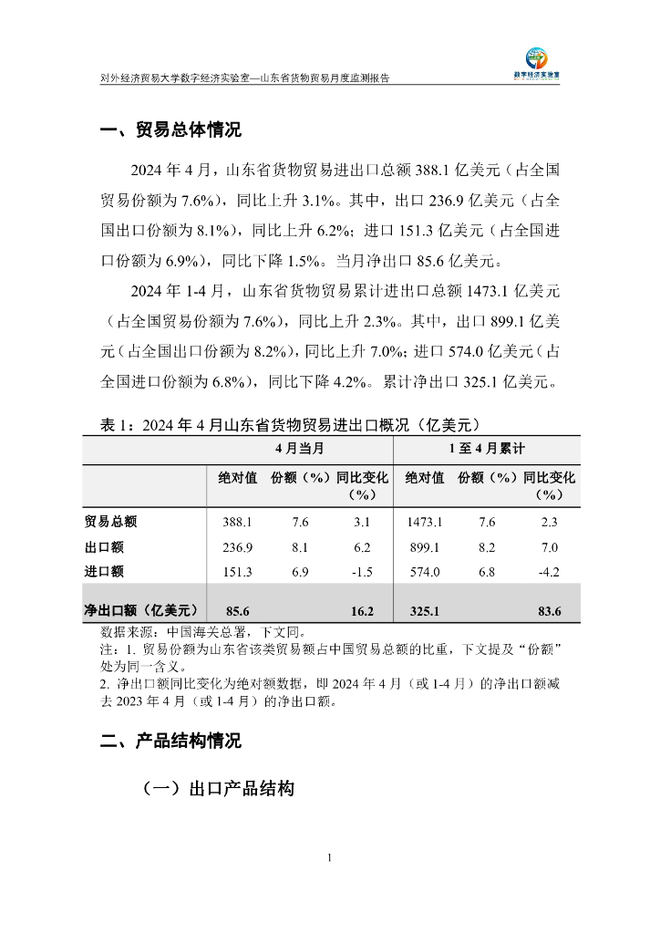 对外经济贸易大学:山东省货物贸易月度监测报告(2024年1-4月).pdf