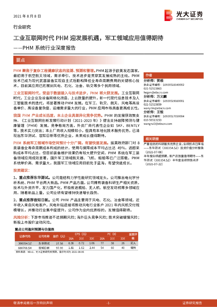 光大证券:PHM系统行业深度报告:工业互联网时代PHM迎发展机遇,军工领域应用值得期待.pdf
