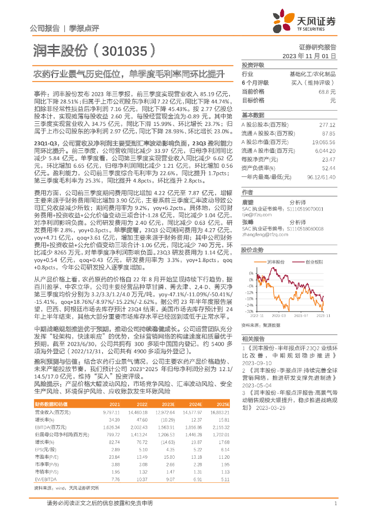 天风证券:润丰股份(301035)-农药行业景气历史低位,单季度毛利率同环比提升.pdf