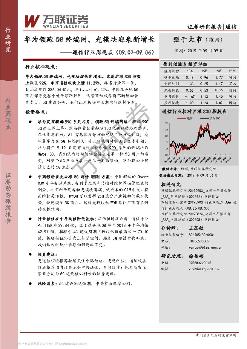 万联证券:通信行业周观点:华为领跑5G终端网,光模块迎来新增长.pdf