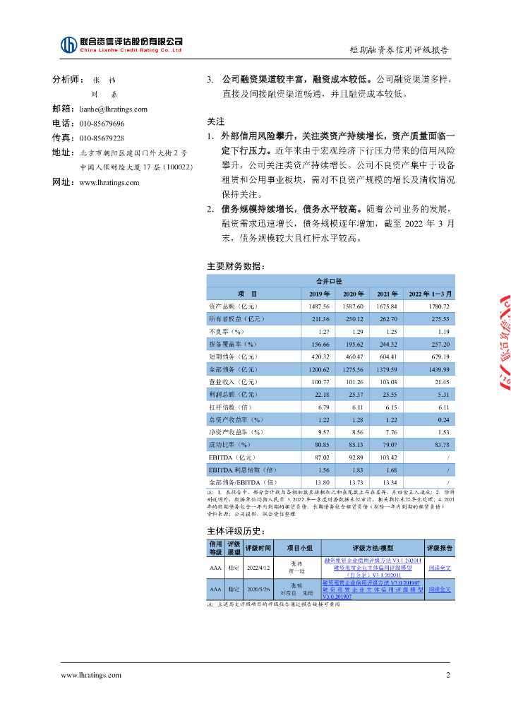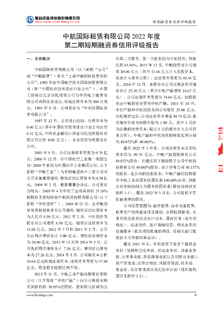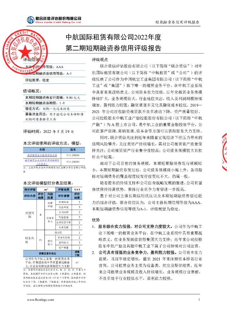 联合资信:中航国际租赁有限公司2022年度第二期短期融资券信用评级报告及跟踪评级安排.pdf