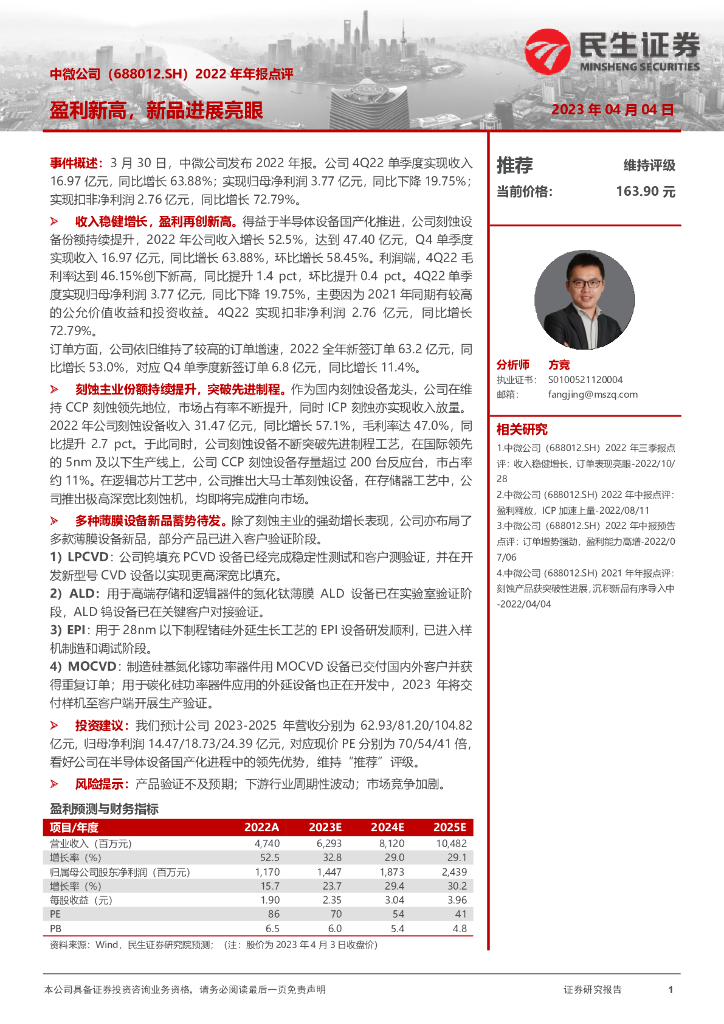 民生证券:中微公司(688012)-2022年年报点评:盈利新高,新品进展亮眼.pdf
