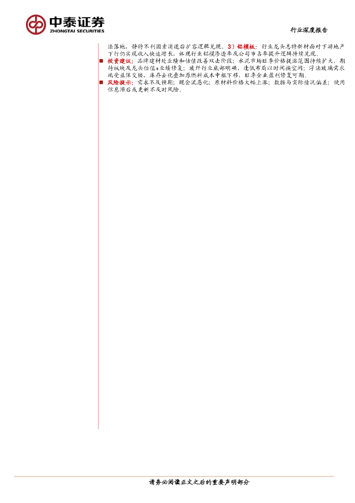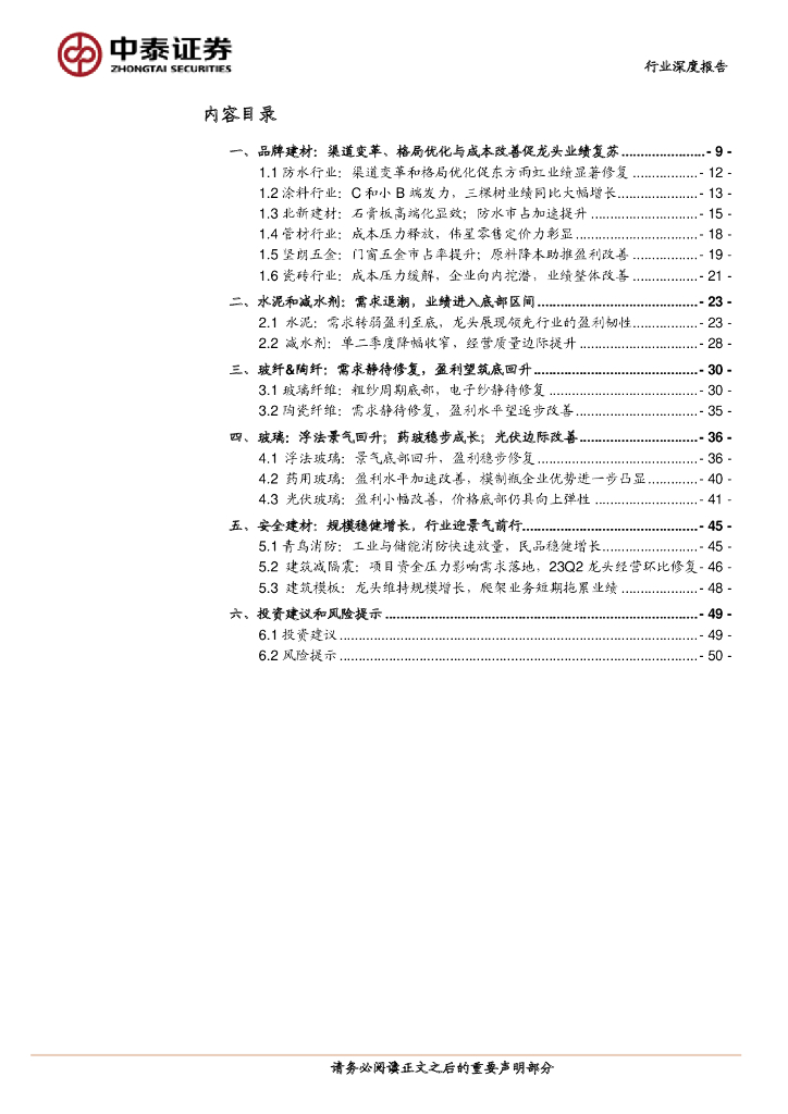 中泰证券:2023年建材行业中报总结:行业底部龙头彰显强阿尔法,静待总量需求回升.pdf