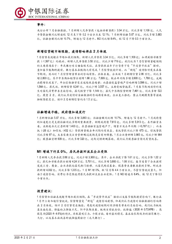 中银证券:银行-1月金融数据点评:信贷超预期多增,M1增速降至0%.pdf