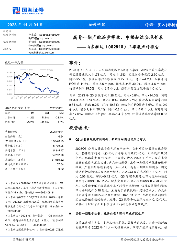 国海证券:山东赫达(002810)-三季度点评报告:高青一期产能逐步释放,中福赫达实现并表.pdf