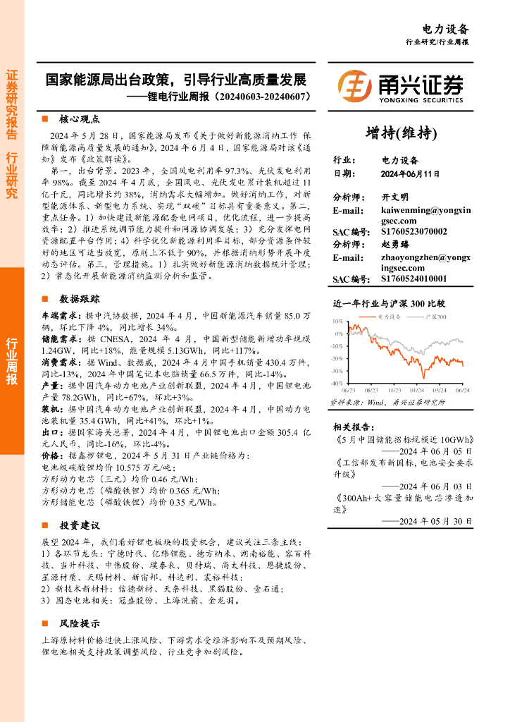 甬兴证券:锂电行业周报:国家能源局出台政策,引导行业高质量发展.pdf