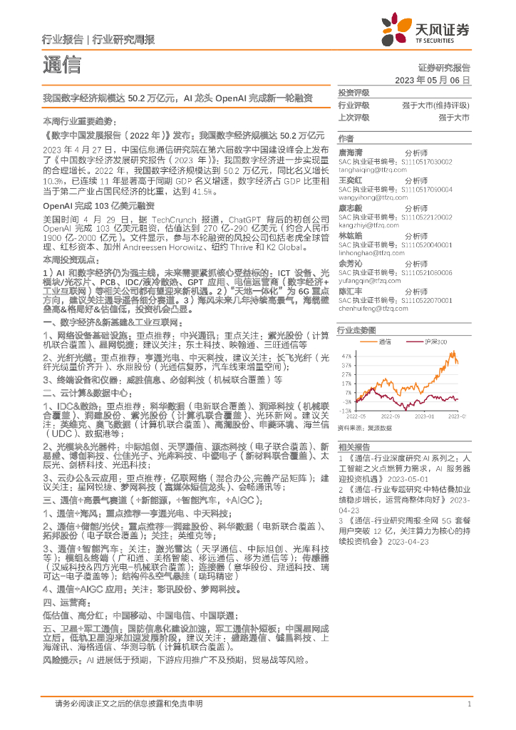 天风证券:通信行业研究周报:我国数字经济规模达50.2万亿元,AI龙头OpenAI完成新一轮融资.pdf