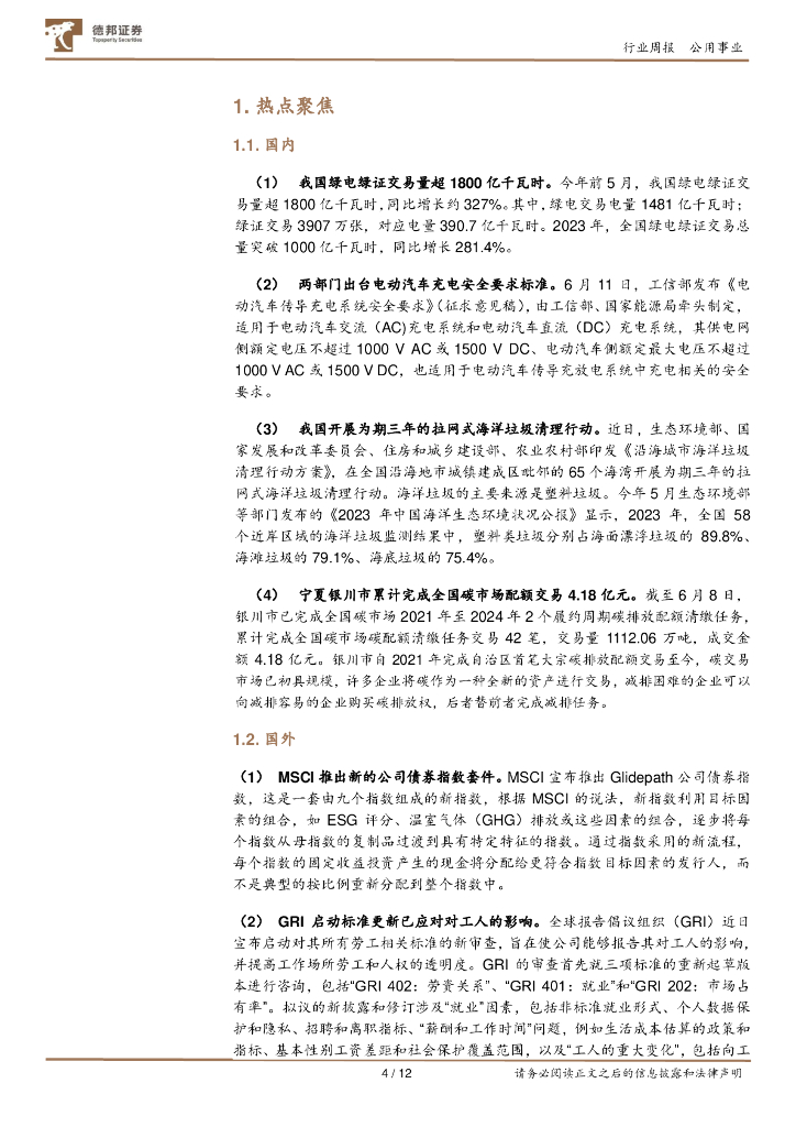 德邦证券:公用事业行业ESG周报:我国绿电绿证交易量超1800亿千瓦时;MSCI推出新的公司债券指数套件.pdf