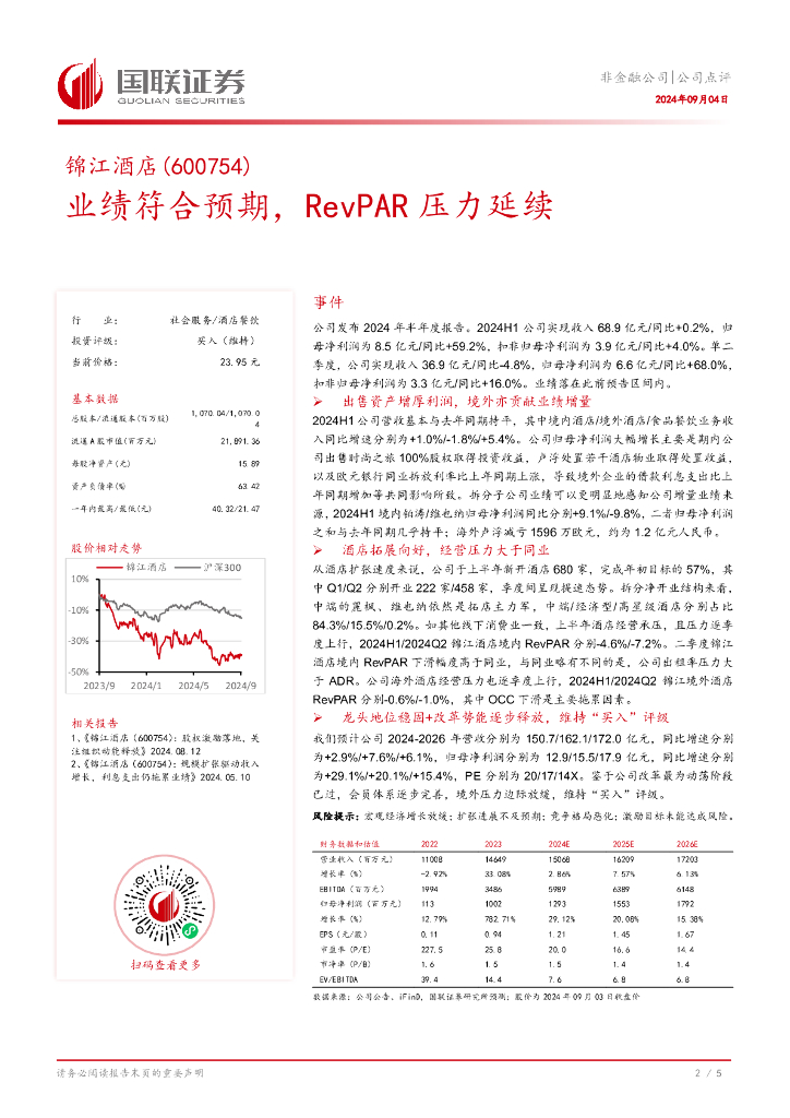 国联证券:锦江酒店(600754)-业绩符合预期,RevPAR压力延续.pdf
