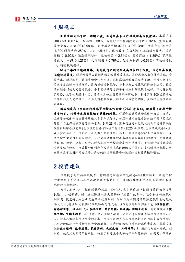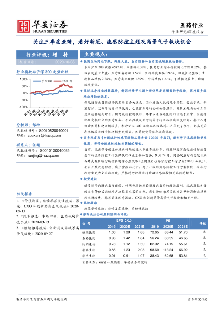 华安证券:医药行业:关注三季度业绩,看好新冠、流感防控主题及高景气子板块机会.pdf