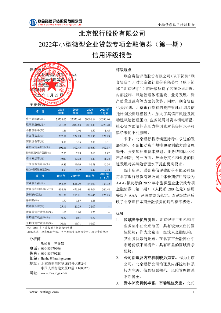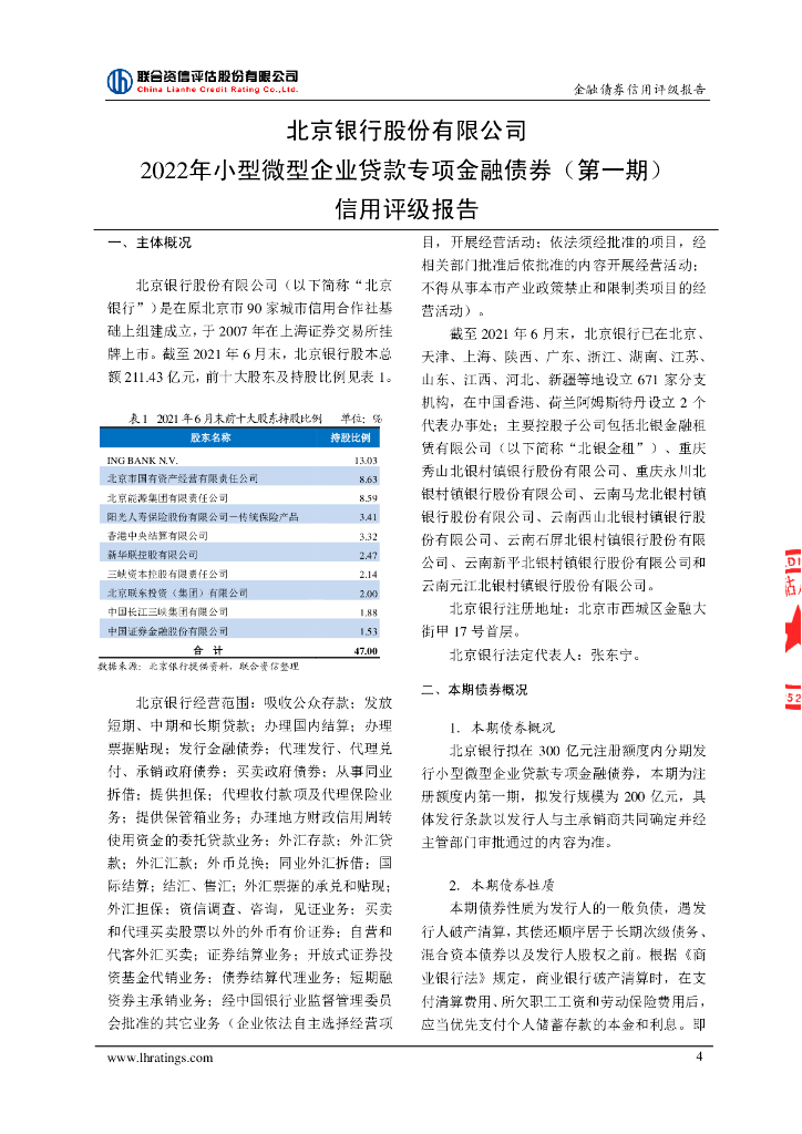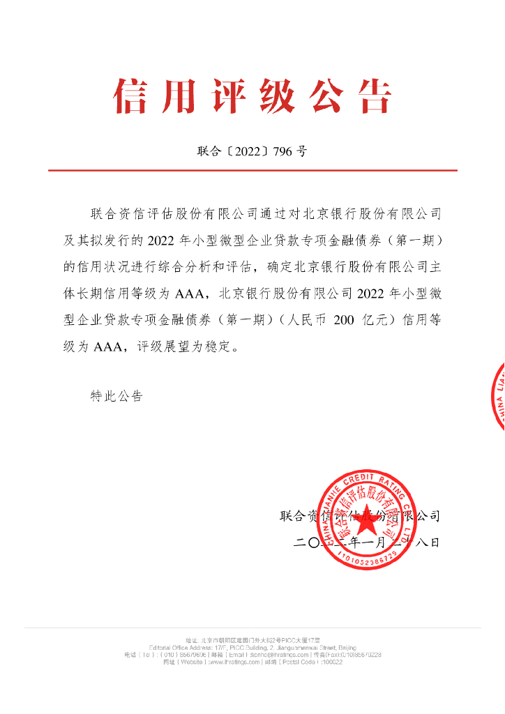 联合资信:北京银行股份有限公司2022年小型微型企业贷款专项金融债券(第一期)信用评级报告及跟踪评级安排说明.pdf