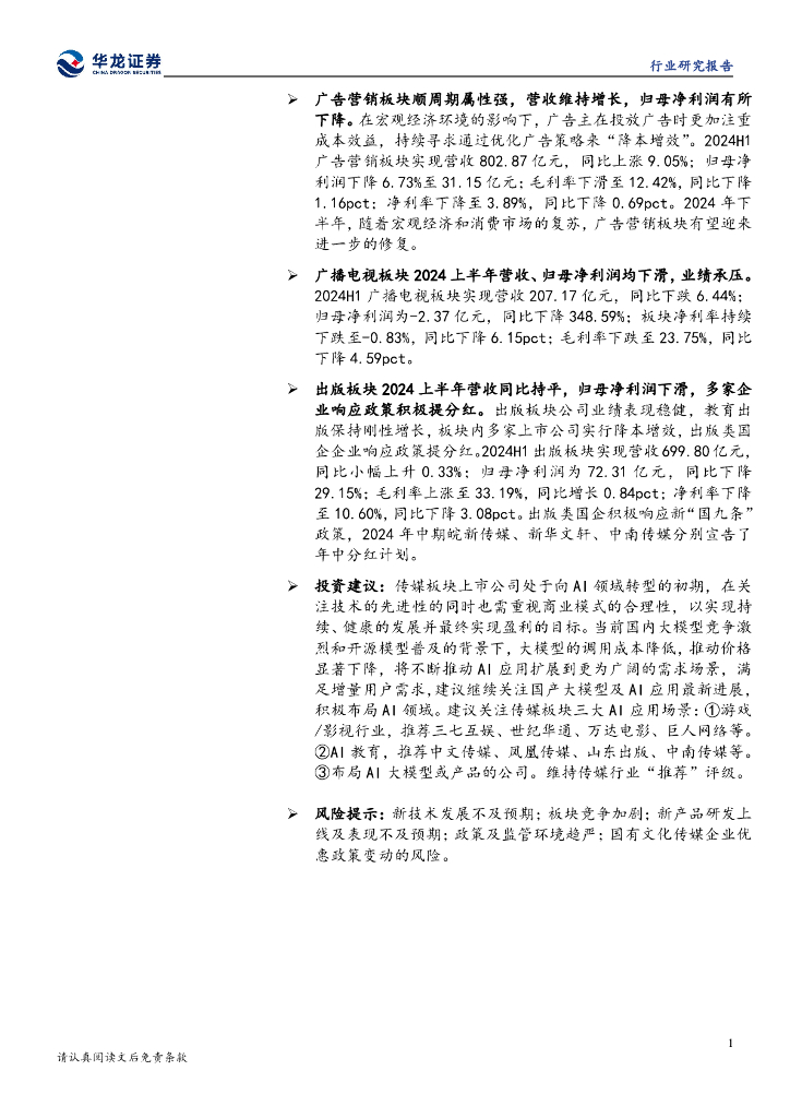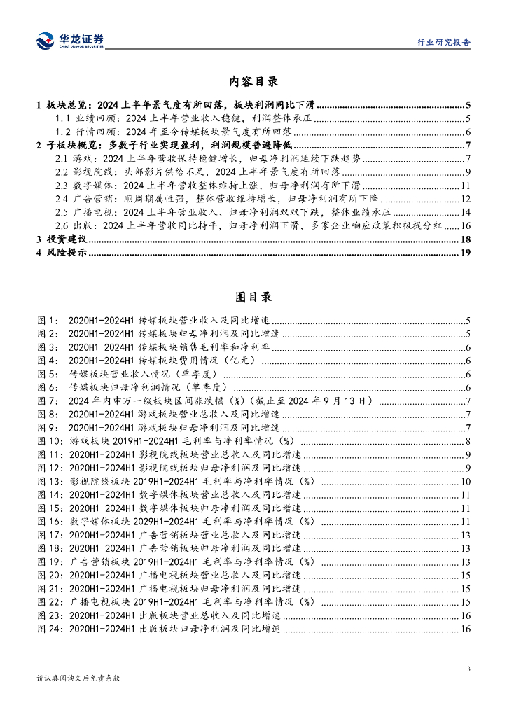 华龙证券:传媒行业2024年半年报综述:2024上半年传媒业绩承压,下半年有望持续改善.pdf