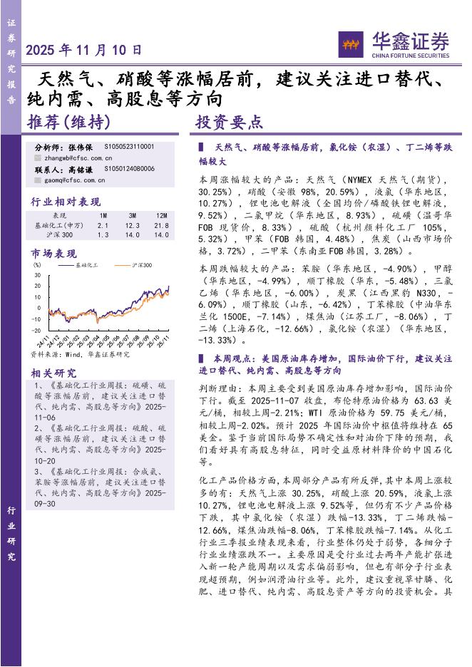 华鑫证券:基础化工行业周报:天然气、硝酸等涨幅居前,建议关注进口替代、纯内需、高股息等方向.pdf