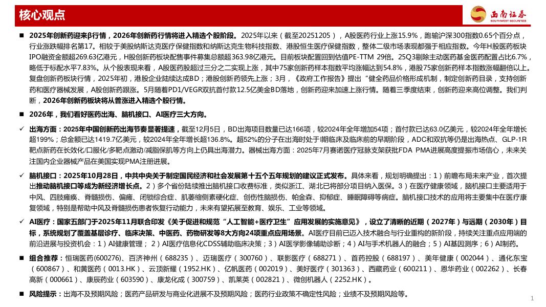 西南证券:医药行业2026年投资策略:创新药板块进入精选个股行情,关注出海、脑机接口、AI医疗三大方向.pdf