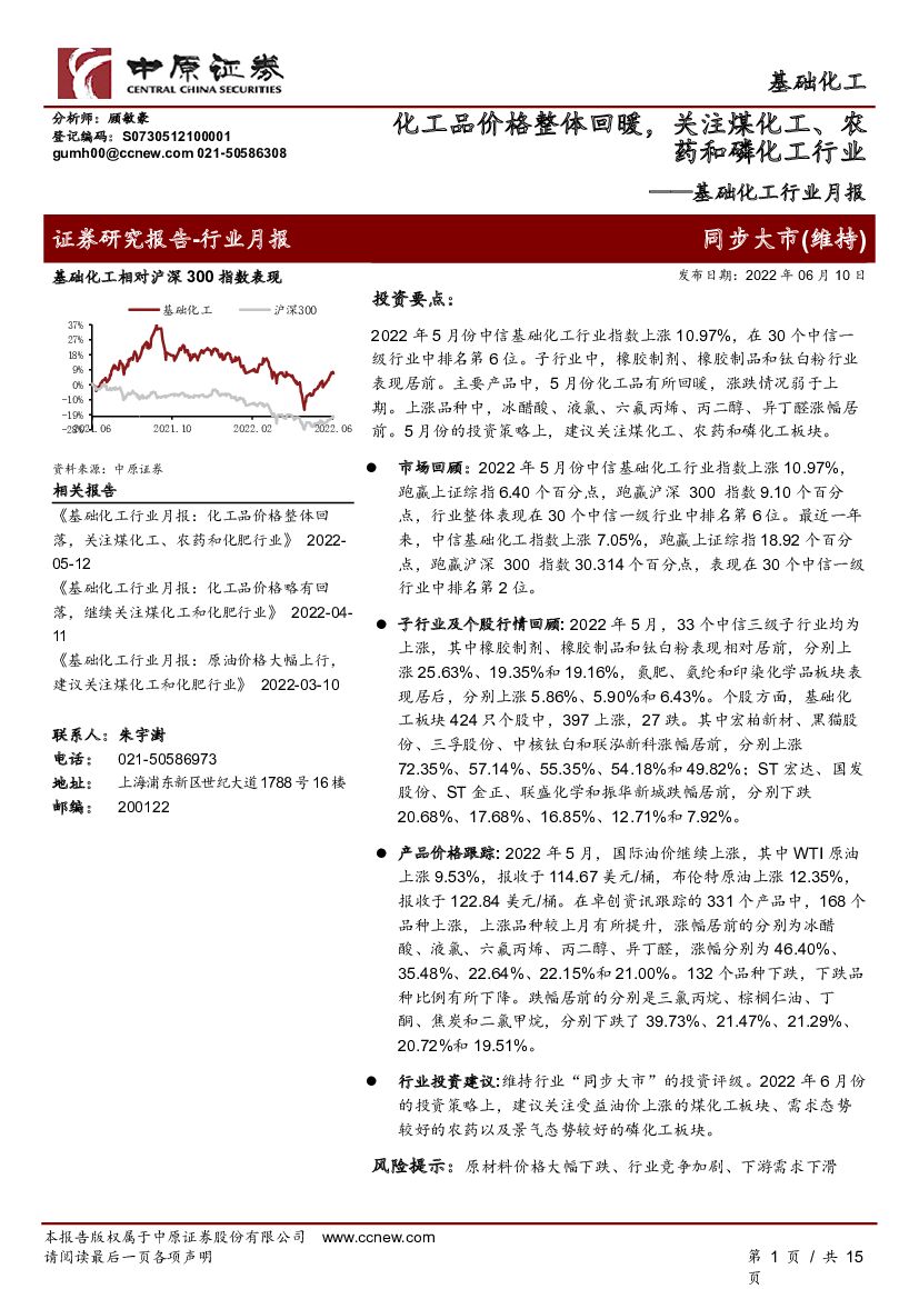 中原证券:基础化工行业月报:化工品价格整体回暖,关注煤化工、农药和磷化工行业.pdf