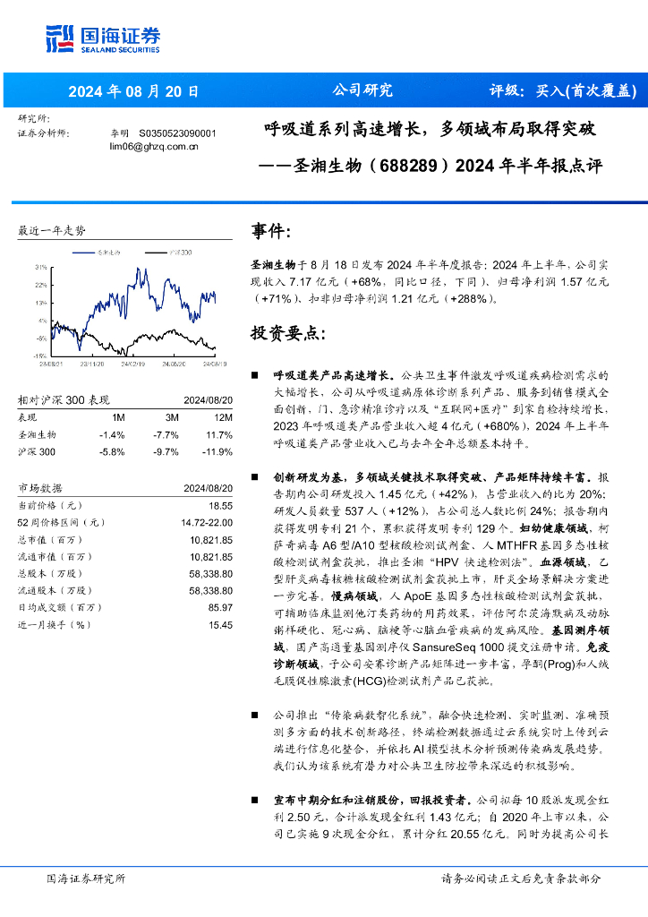 国海证券:圣湘生物(688289)-2024年半年报点评:呼吸道系列高速增长,多领域布局取得突破.pdf