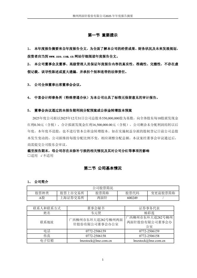 600249-两面针:两面针2025年年度报告摘要.pdf