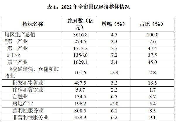初步核算,全市地区生产总值3616.8亿元,增长4.5%。其中,第一产业增加值274.5亿元,增长3.3%;第二产业增加值1713.2亿元,增长5.7%;第三产业增加值1629.1亿元,增长3.4%。三次产业结构分别为7.6:47.4:45。第一、二、三产业对GDP增幅的贡献率分别为6.2%、59.3%和34.5%。全市人均GDP为93284元,增长4.9%。