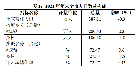2022年,全市年末常住人口387.11万人,较上年减少1.22万人,其中,城镇人口280.53万人,较上年增加0.77万人;乡村人口106.58万人,较上年减少1.99万人;城镇化率为72.47%,较上年提升0.43个百分点。