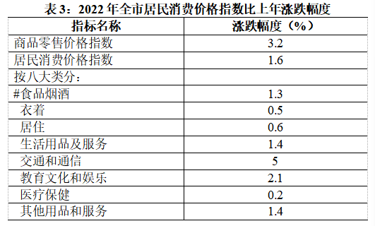 全年商品零售价格上涨3.2%。居民消费价格上涨1.6%,其中:食品烟酒价格上涨1.3%,衣着价格上涨0.5%,居住价格上涨0.6%,生活用品及服务价格上涨1.4%,交通和通信价格上涨5%,教育文化和娱乐价格上涨2.1%,医疗保健价格上涨0.2%,其他用品和服务价格上涨1.4%。