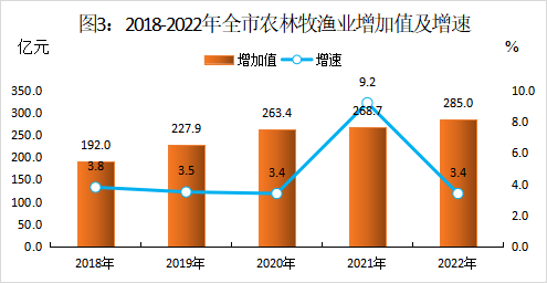 全年农林牧渔业实现增加值285亿元,增长3.4%。农林牧渔业总产值429.43亿元,增长3.4%。其中:农业产值214.49亿元,增长3.3%;林业产值33.63亿元,增长3.0%;牧业产值145.76亿元,增长2.9%;渔业产值18.77亿元,增长3.5%;农林牧渔服务业产值16.78亿元,增长9.5%。全市粮食种植面积220.2千公顷,下降0.6%;全市蔬菜及食用菌面积83.96千公顷,增长1.6%;油料面积57.7千公顷,增长6.9%。