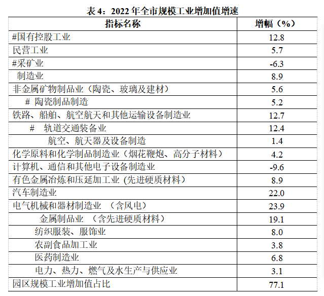 全年规模工业增加值增长8.3%,分经济类型看,国有控股工业增长12.8%,民营工业增长5.7%;分三大门类看,采矿业下降6.3%,制造业增长8.9%,电力、热力、燃气及水生产和供应业增长3.1%;分行业看,铁路、船舶、航天航空和其他运输设备制造业增长12.7 %,汽车制造业增长22.0 %,纺织服装、服饰业增长8%,化学原料和化学制品制造业增长4.2 %,医药制造业增长6.8%、农副食品加工制造业增长3.8 %,陶瓷制品制造业增长5.2%,有色金属冶炼和压延加工业增长8.9 %,计算机、通信和其他电子设备制造业下降9.6 %。省级及以上产业园区工业增加值增长10.4%,占规模工业比重为77.1%。全年规模工业企业营业收入增长7.7%,利润增长32.5%。百元营业收入成本79.18 %,下降0.6%。