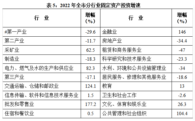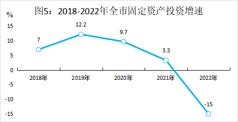 全年固定资产投资下降15%。分产业看,第一产业投资下降29.6%,第二产业投资下降11.7%,其中工业投资下降11.5%,第三产业投资下降17.1%;分经济类型看,国有投资增长12.9%,民间投资下降17.9%;分领域看,产业投资下降12.9%,高新技术产业投资下降21.6%,民生工程投资增长8.2%,生态环境投资增长19.2%,基础设施投资下降8%,建安投资下降6.8%。全年房地产开发投资271.3亿元,下降35%,商品房销售面积402.4万平方米,下降30%。