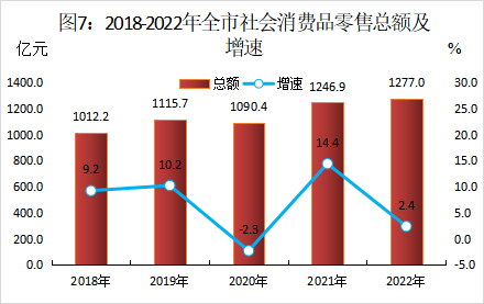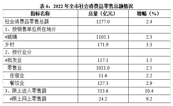 全年社会消费品零售总额1277.02亿元,增长2.4%。分经营地看,城镇零售额1105.12亿元,增长2.3%;乡村零售额171.9亿元,增长3.3%。分行业看,批发业117.1亿元,增长1.5%,零售业1021亿元,增长2.5%,住宿业11.6亿元,增长2.2%,餐饮业127.3亿元,增长2.9%。限额以上法人单位商品零售额513.6亿元,增长10.4%,其中,粮油、食品类增长15%,烟酒类增长11.8%,服装、鞋帽、针纺织品类增长3.3%,化妆品类增长8.2%,金银珠宝类下降13.1%,日用品类增长19.5%,家用电器和音像器材类增长6.3%,中西药品类增长14.3%,文化办公用品类增长13.2%,家具类增长43.1%,通讯器材类增长7.9%,石油及制品类增长16.6%,汽车类增长6.5%,建筑及装潢材料类增长22.7%。限额以上网上零售额24.2亿元,增长9.2%。