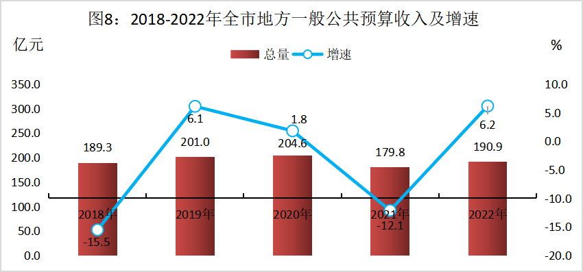 全市地方一般公共预算收入190.9亿元,增长6.2%,其中,市本级完成52.6亿元,增长24.3%;地方税收收入136.2亿元,占地方一般公共预算收入比重为71.3%。