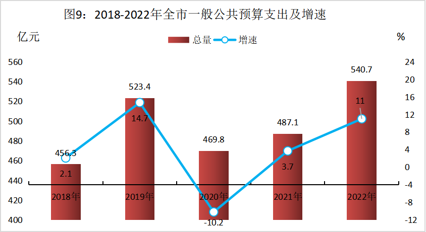 全市一般公共预算支出540.7亿元,增长11%。财政用于民生支出435.3亿元,增长20.2%,其中教育支出75.2亿元,增长5.5%,科学技术支出40.6亿元,增长39.3%,卫生健康支出41.1亿元,增长5.4%。