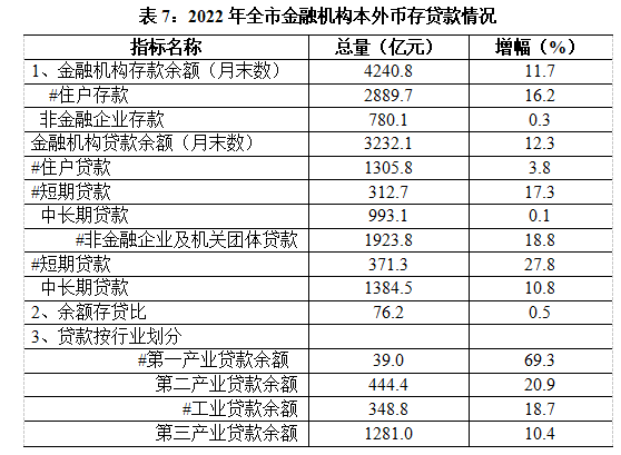 年末,金融机构本外币存款余额4240.8 亿元,比上年末增长11.7%。其中,住户存款余额2889.7 亿元,增长16.2%;非金融企业存款余额780.1亿元,增长0.3%。金融机构本外币贷款余额3232.1 亿元,增长12.3 %。余额存贷比为76.2%。