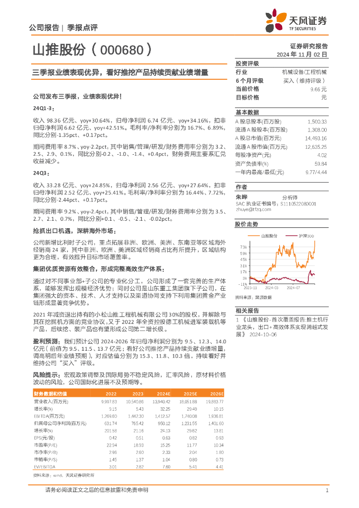 天风证券:山推股份(000680)-三季报业绩表现优异,看好推挖产品持续贡献业绩增量.pdf
