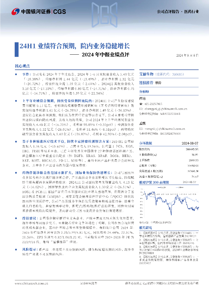 中国银河:艾德生物(300685)-2024年中报业绩点评:24H1业绩符合预期,院内业务稳健增长.pdf