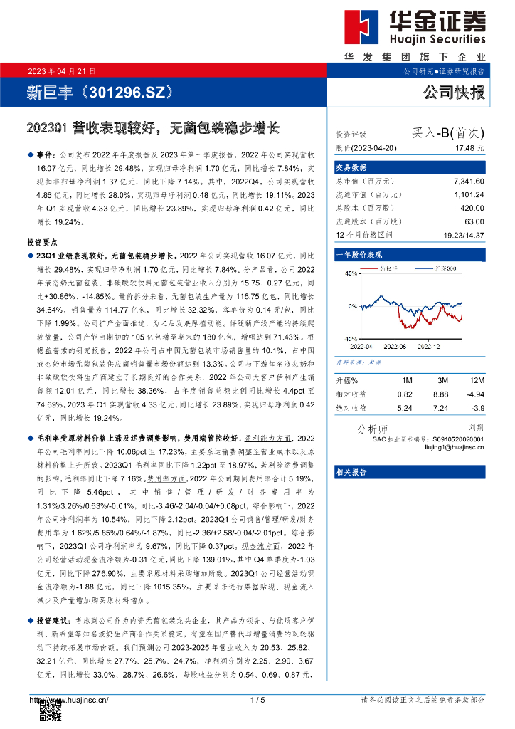 华金证券:新巨丰(301296)-2023Q1营收表现较好,无菌包装稳步增长.pdf