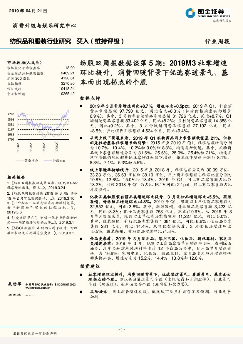 国金证券:纺服双周报数据谈第5期:2019M3社零增速环比提升,消费回暖背景下优选赛道景气、基本面出现拐点的个股.pdf
