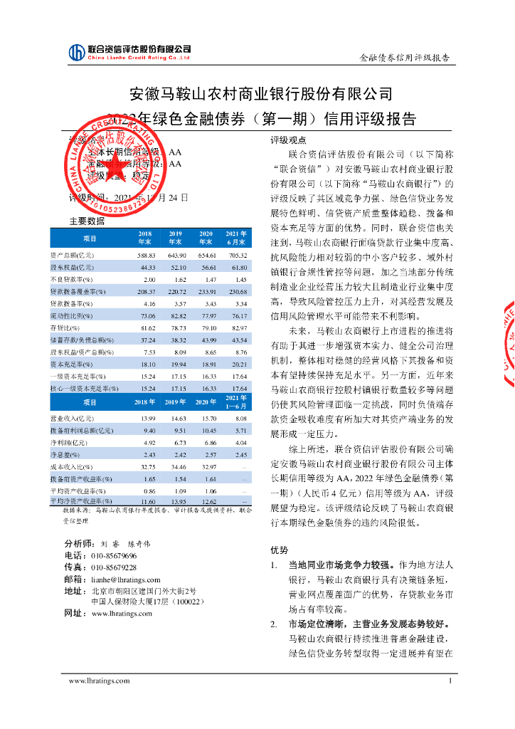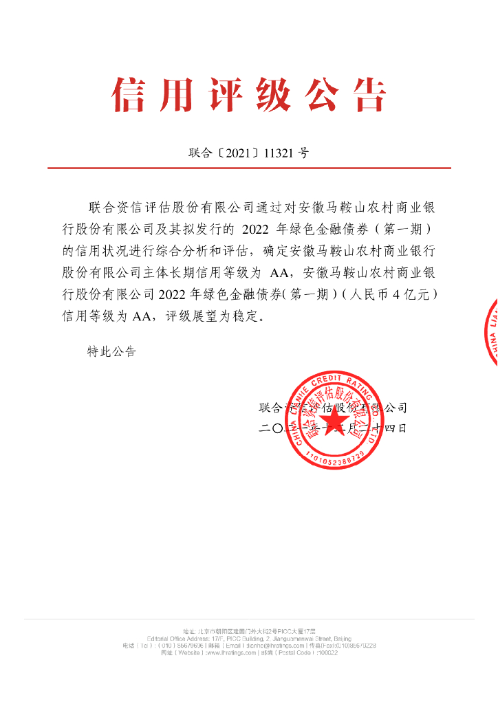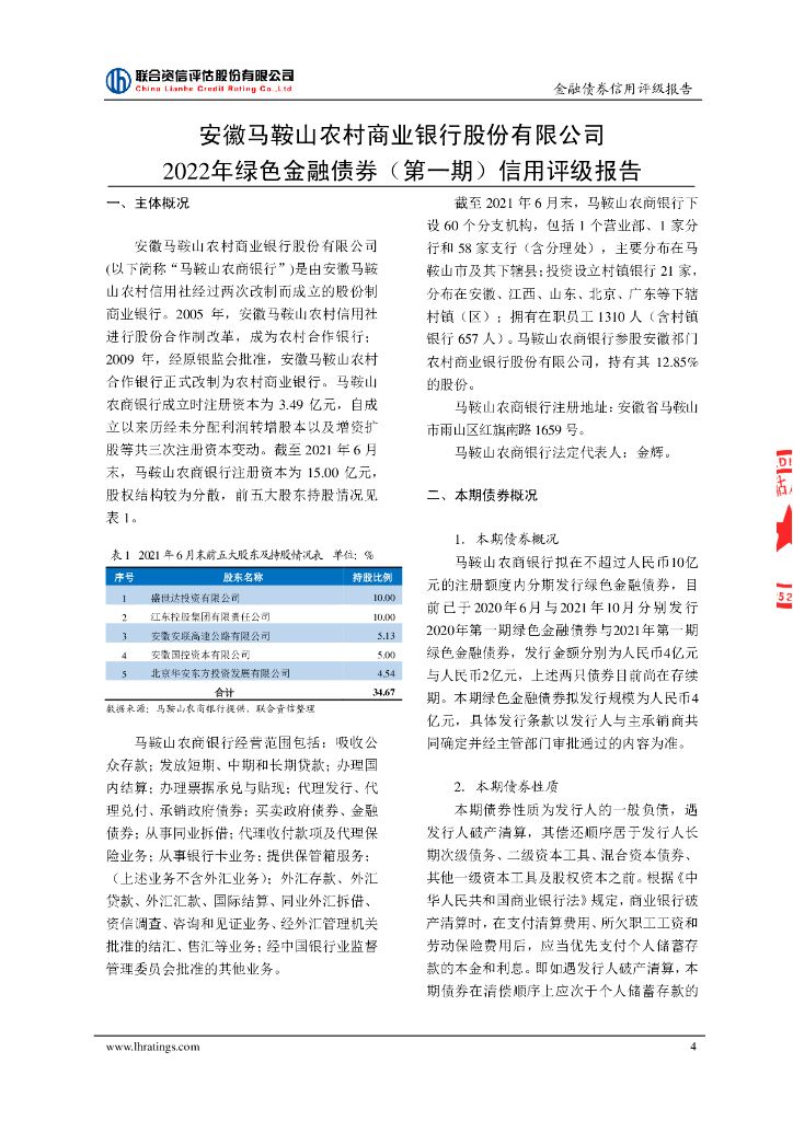联合资信:安徽马鞍山农村商业银行股份有限公司2022年绿色金融债券(第一期)信用评级报告.pdf