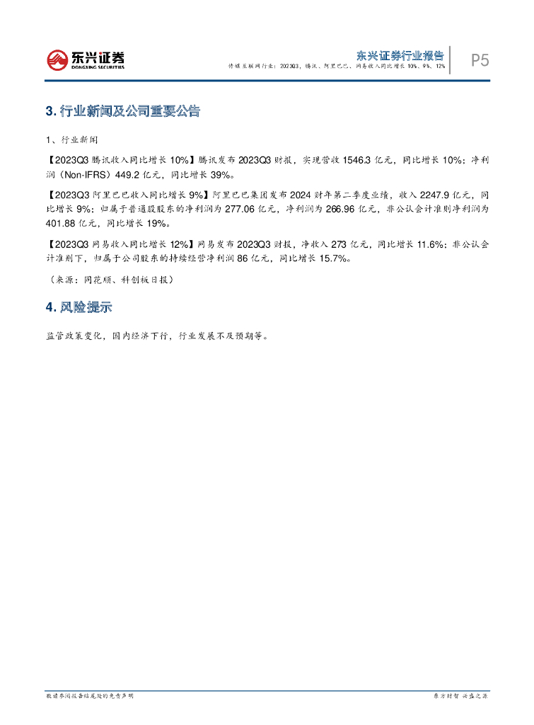 东兴证券:传媒互联网行业:2023Q3,腾讯、阿里巴巴、网易收入同比增长10%、9%、12%.pdf