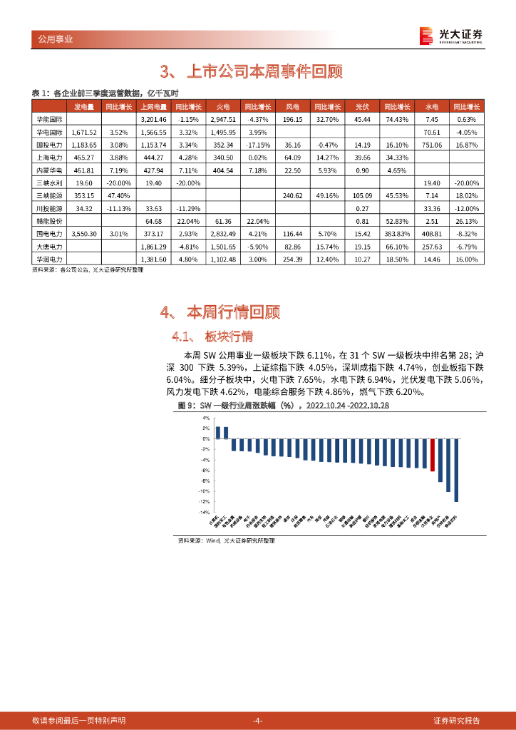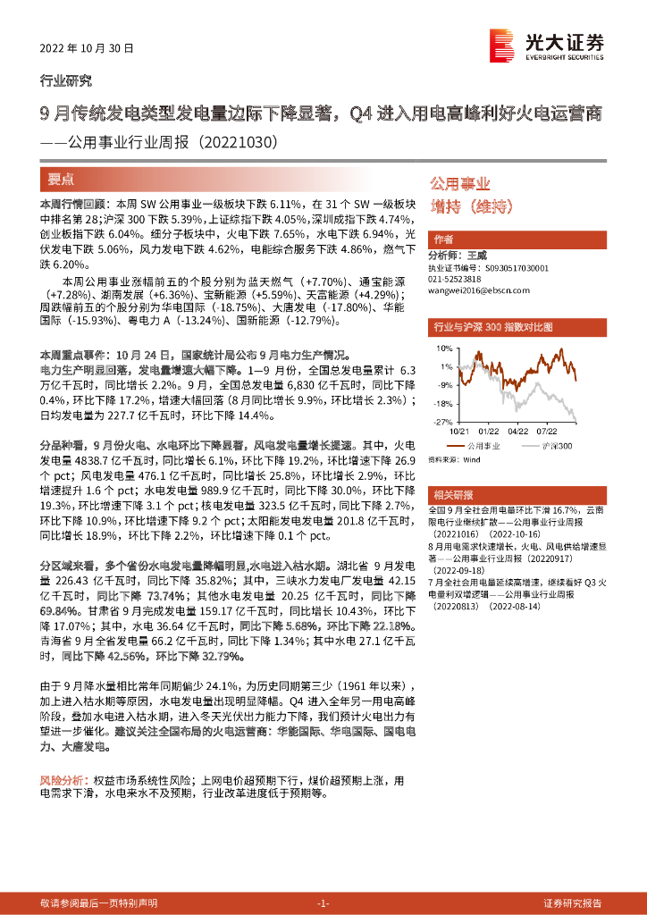 光大证券:公用事业行业周报:9月传统发电类型发电量边际下降显著,Q4进入用电高峰利好火电运营商.pdf