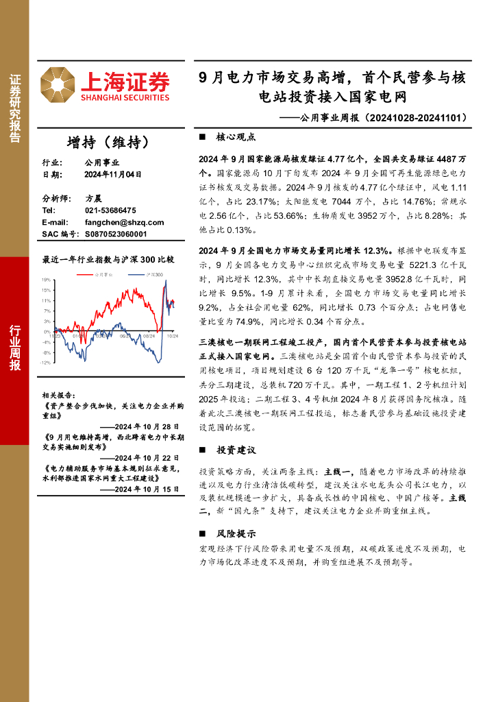 上海证券:公用事业行业周报:9月电力市场交易高增,首个民营参与核电站投资接入国家电网.pdf