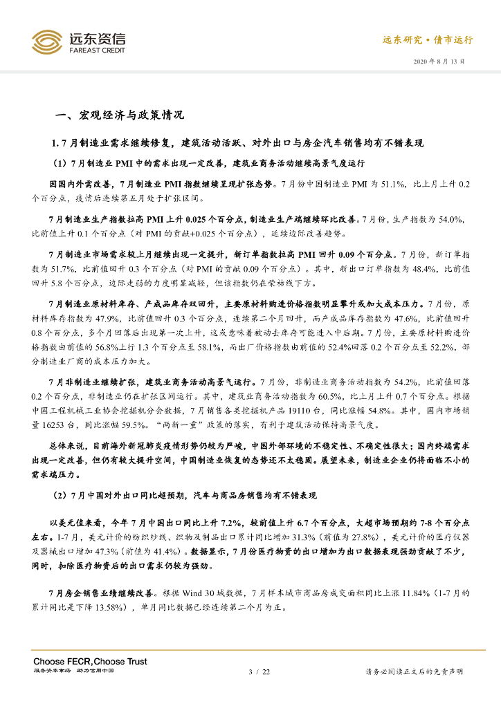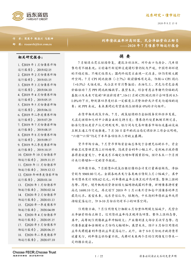 远东资信:2020年7月债券市场运行报告:利率债收益率冲高回落,民企净融资由正转负.pdf