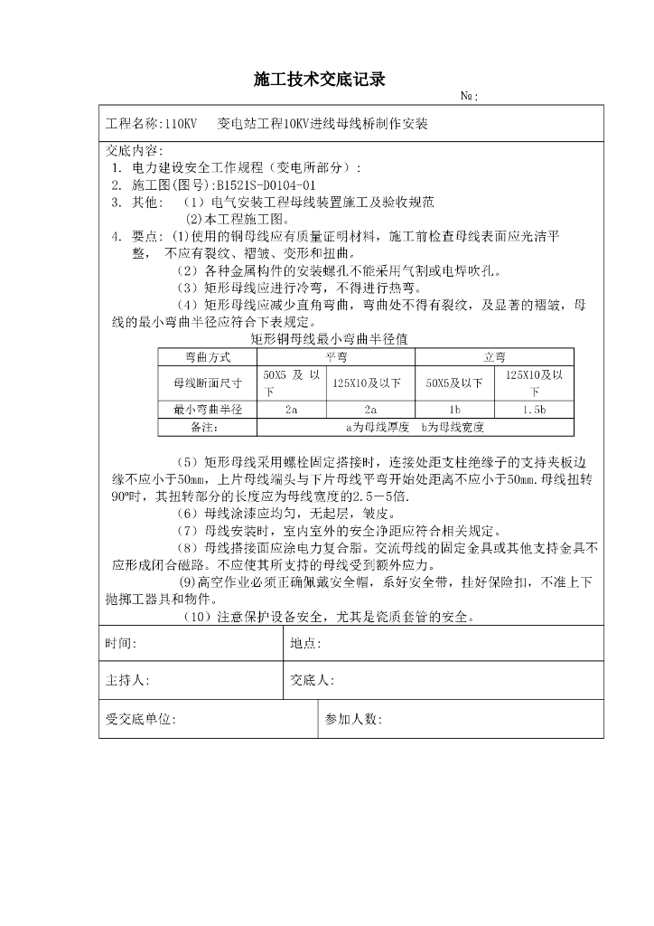 10kv进线母线制作安装施工技术安全交底记录.doc