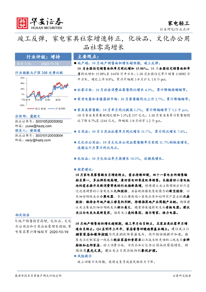 华安证券:家电轻工行业研究:竣工反弹,家电家具社零增速转正,化妆品、文化办公用品社零高增长.pdf