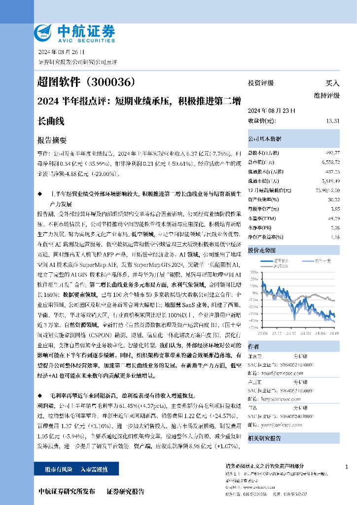 中航证券:超图软件(300036)-2024半年报点评:短期业绩承压,积极推进第二增长曲线.pdf