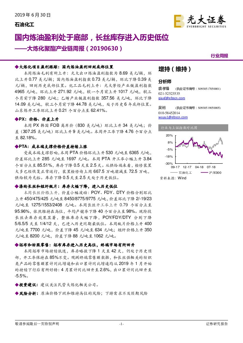 光大证券:大炼化聚酯产业链周报:国内炼油盈利处于底部,长丝库存进入历史低位.pdf