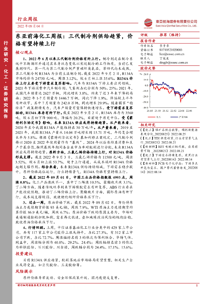 东亚前海证券:东亚前海化工周报:三代制冷剂供给趋紧,价格有望持续上行.pdf