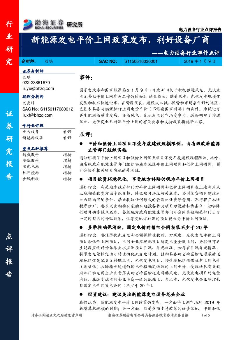 渤海证券:电力设备行业事件点评:新能源发电平价上网政策发布,利好设备厂商.pdf