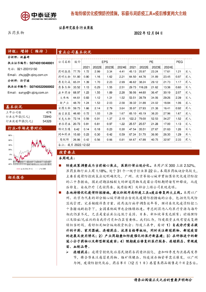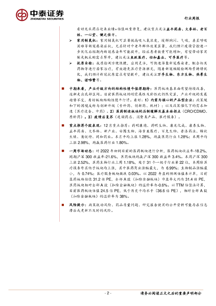 中泰证券:医药生物行业周报:各地持续优化疫情防控措施,积极布局防疫工具+疫后修复两大主线.pdf