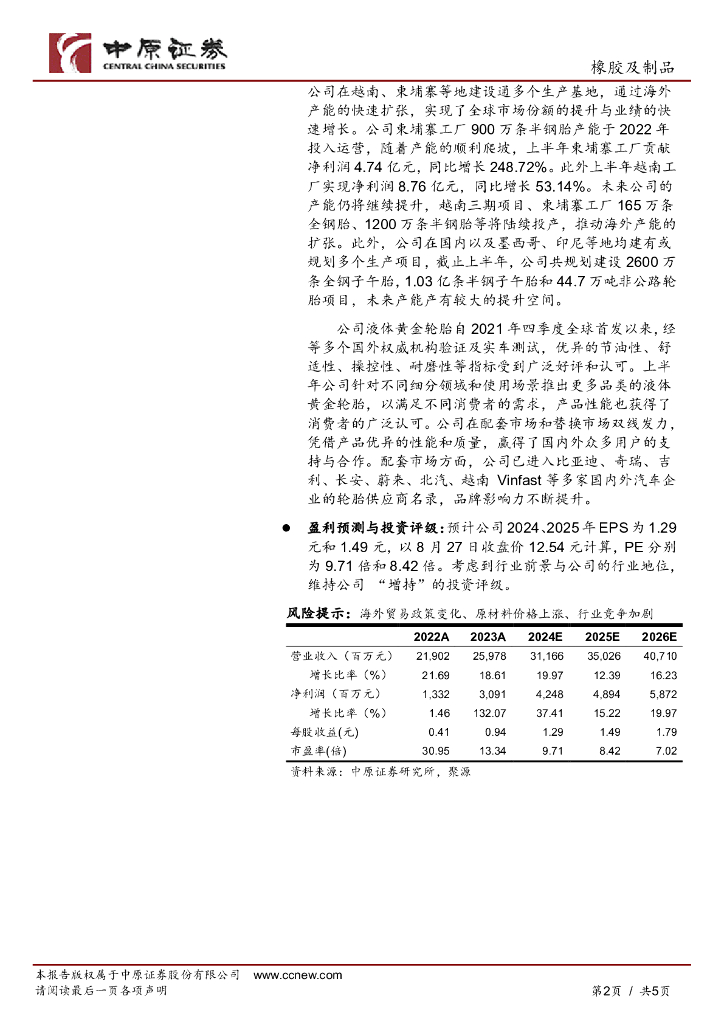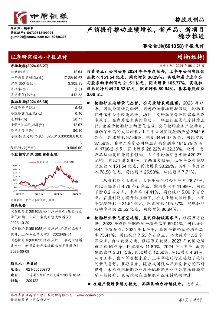 中原证券:赛轮轮胎(601058)-中报点评:产销提升推动业绩增长,新产品、新项目稳步推进.pdf