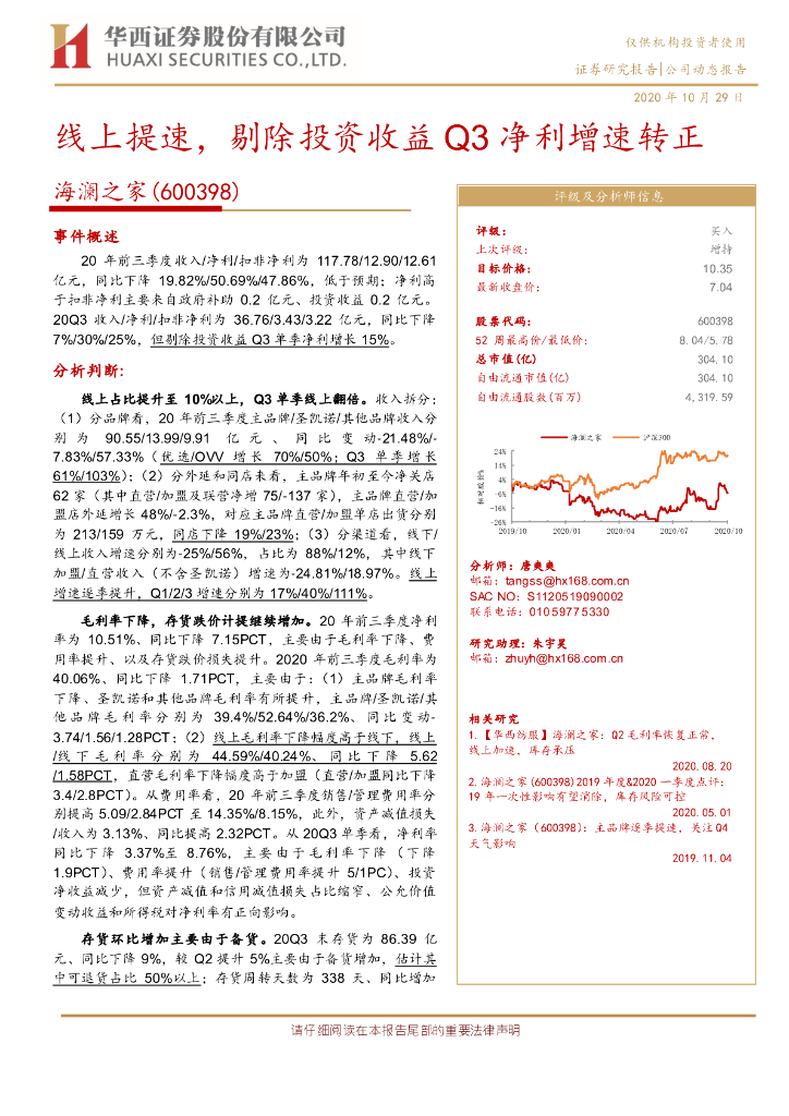 华西证券:海澜之家(600398)-线上提速,剔除投资收益Q3净利增速转正.pdf