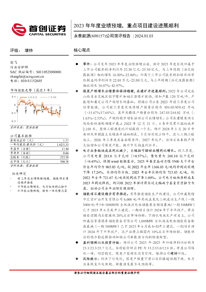 首创证券:永泰能源(600157)-公司简评报告:2023年年度业绩预增,重点项目建设进展顺利.pdf